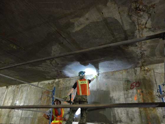 (4)快速微膨胀水泥逐层填补后进行抹平、修边,在破损深度及面积均较大时可在修补处设置靠模;